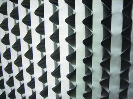 2.濾料采用耐高濕超細(xì)玻璃纖維濾紙制成,以鋁箔板做分隔。波紋形紙隔板或鋁隔板維持每一褶紙之間等距間隔,氣流易于穿過(guò),確保濾材有效利用及增加強(qiáng)度。