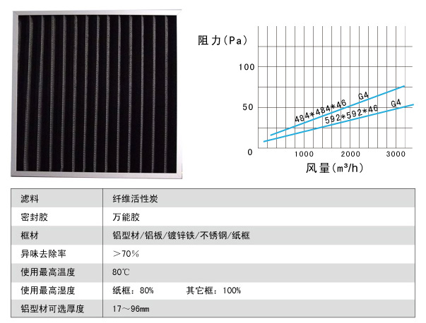 板式初效活性炭過(guò)濾器運(yùn)行條件及風(fēng)阻圖