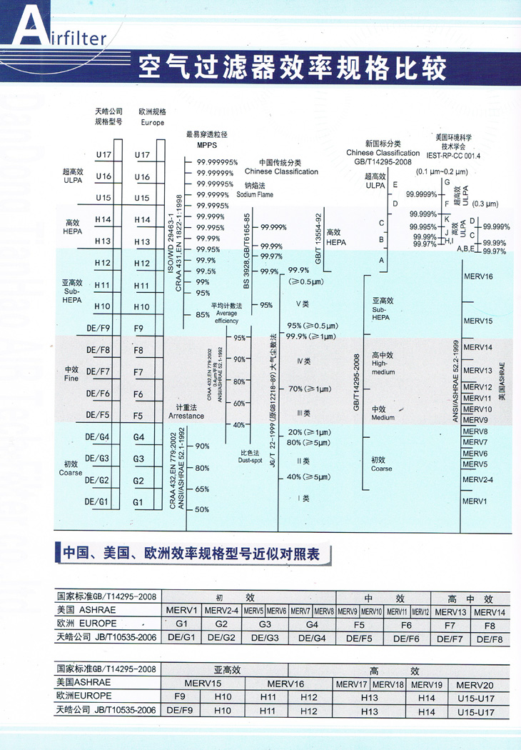 國內外最新空氣過濾器效率規格表包括國標,美標,歐標三種國際標準